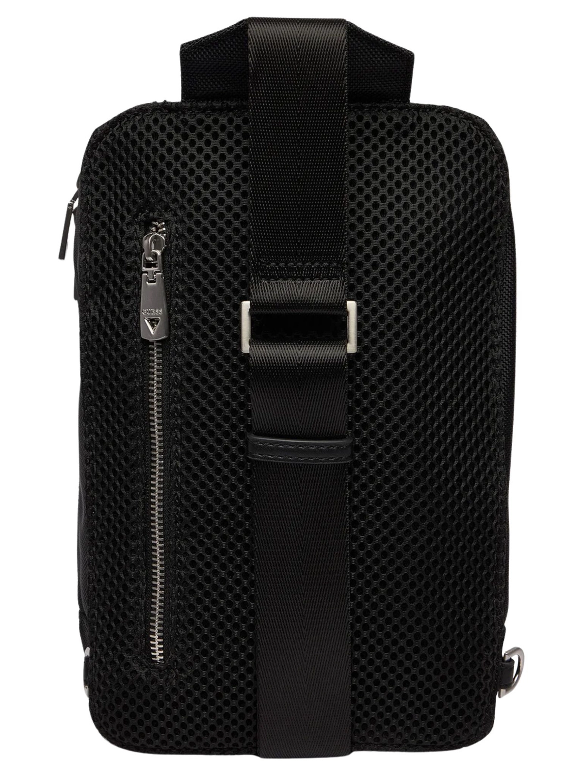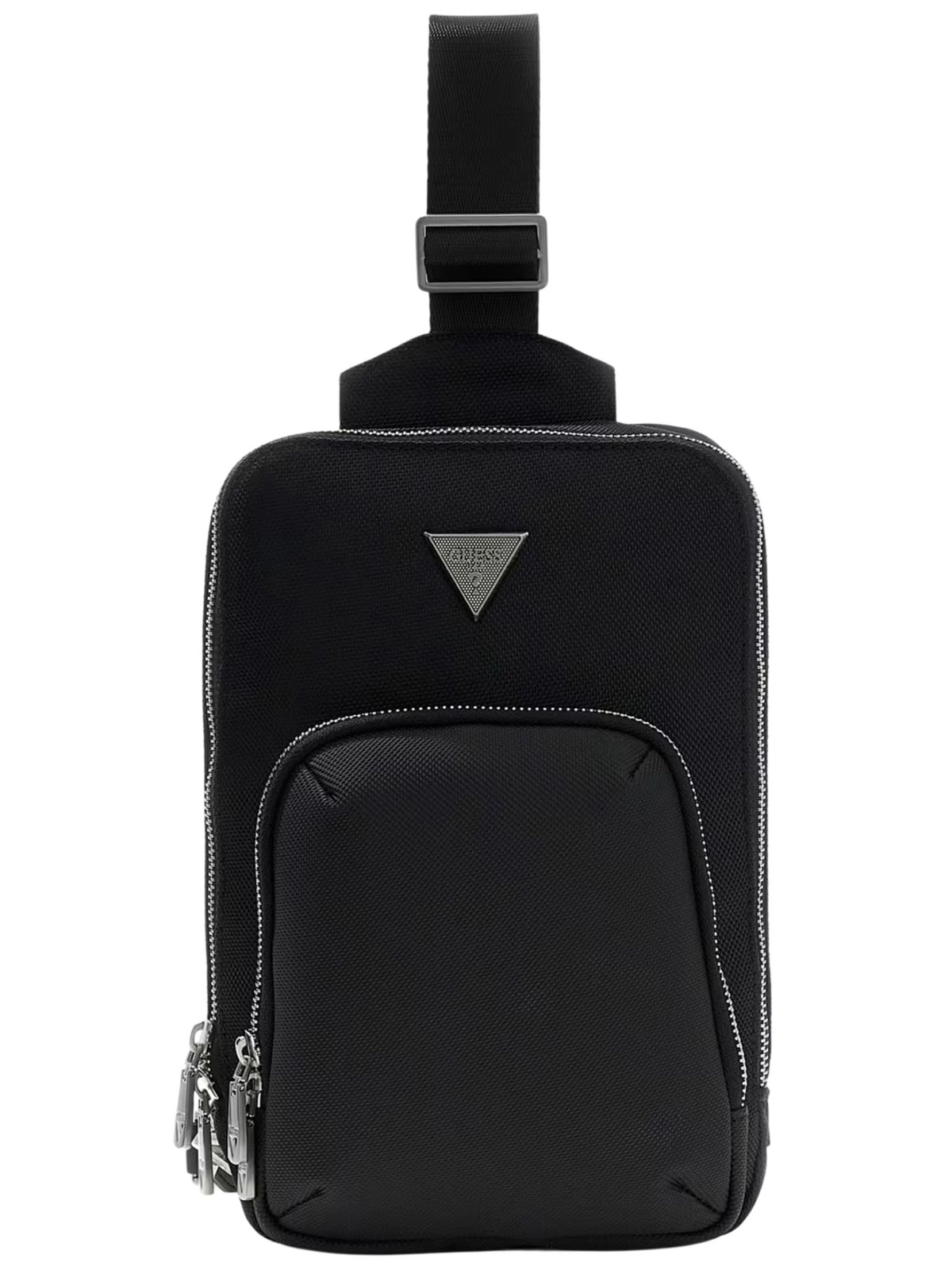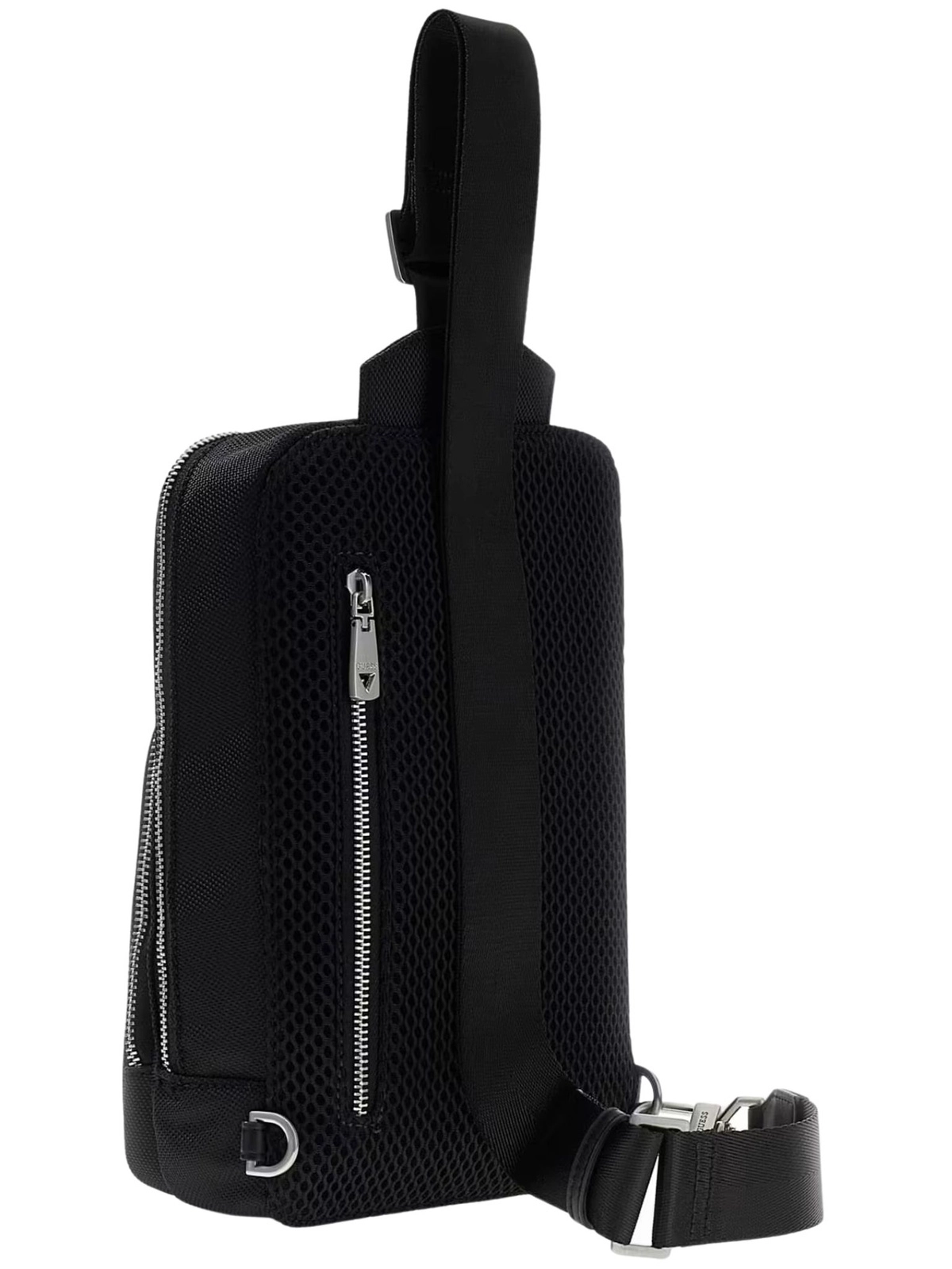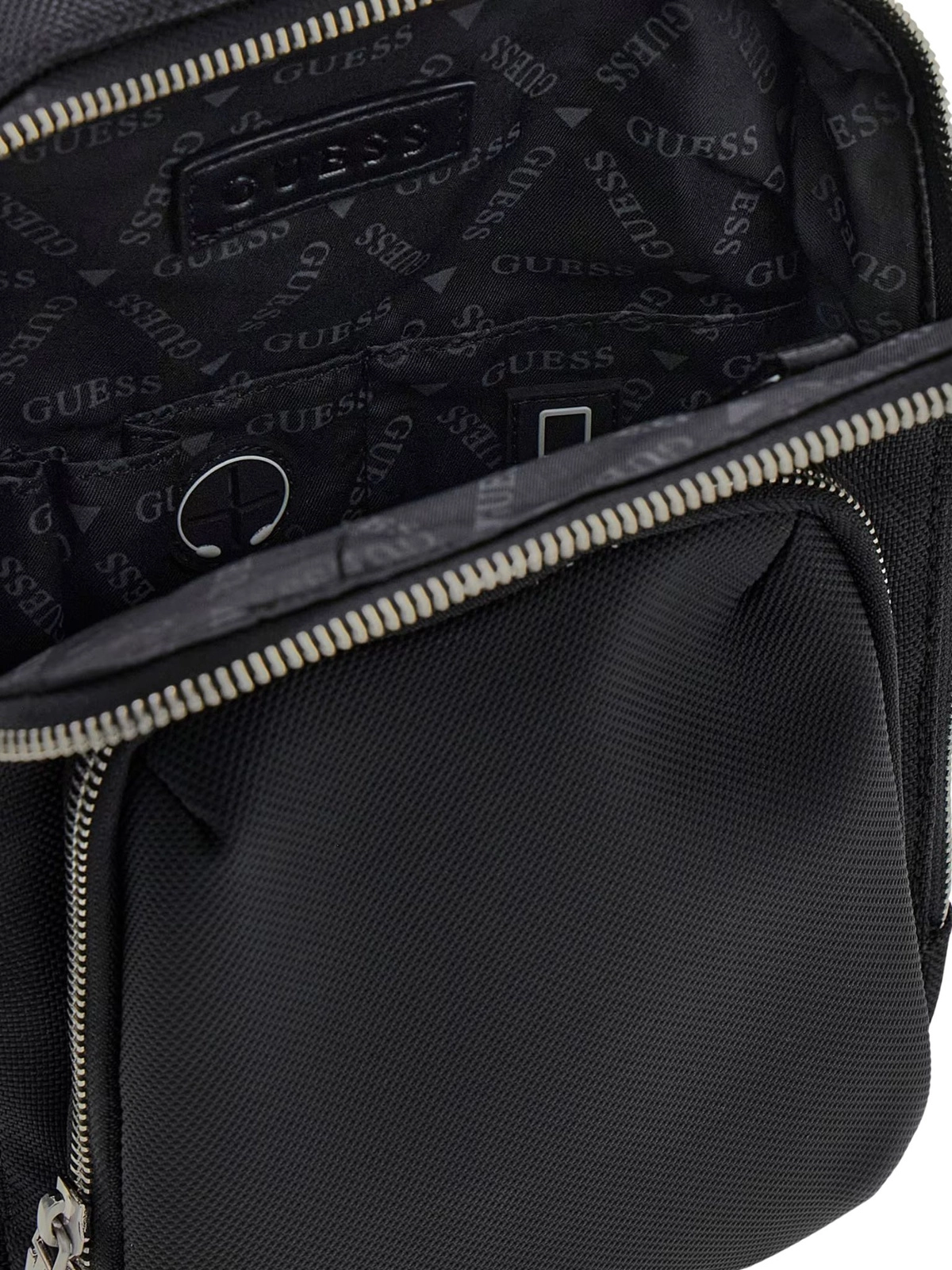 Logo marki Guess na przodzie, wewnątrz, zawieszkach od suwaków, karabińczyku oraz metalowym breloku